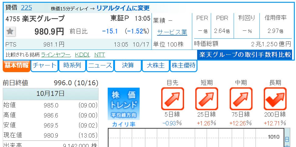 現在(2025年10月17日)の楽天グループの株価は980円ほどです。