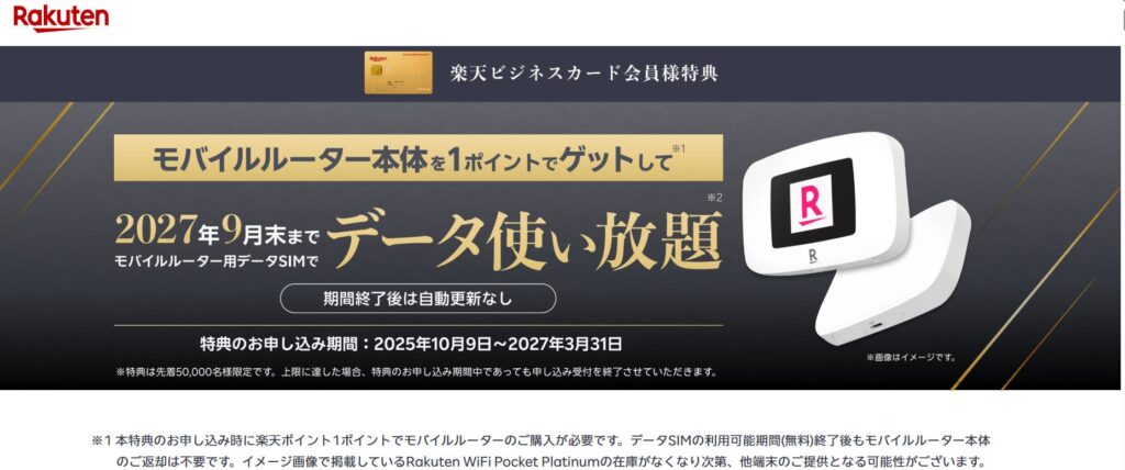楽天ビジネスカードユーザーは申し込むと約2年間モバイルルーターが1ポイントでゲットできると。
